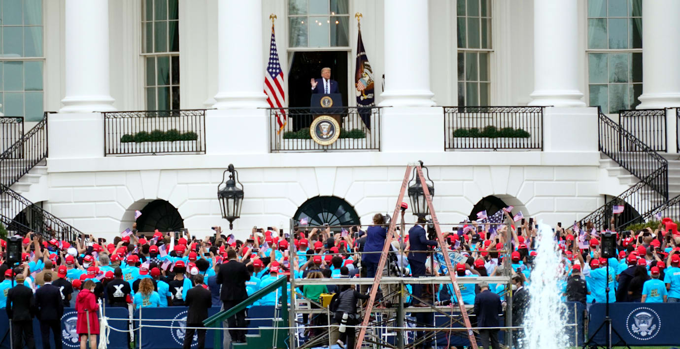 USA:s president Donald Trump håller just nu ett kampanjmöte från en balkong på Vita huset. Nedanför på gräsmattan har en folkmassa samlats.