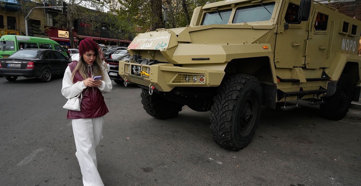 En kvinna kollar sin telefon samtidigt som hon passerar ett militäfrodon p Tajrish-torget i Teheran. (Vahid Salemi /AP/TT / AP)