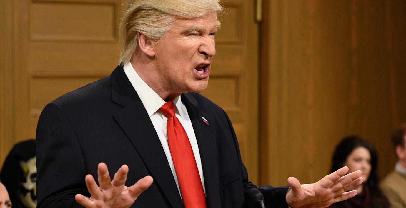 Efter att de sjungit klart sa Alec Baldwins Trumpkaraktär: ”Jag ger inte upp för jag har inte gjort något fel”, skriver Variety.