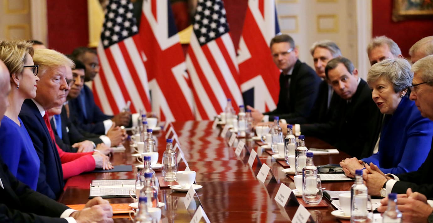 Det var vid en frukost för företagsledare som Trump och den avgående Theresa May talade sig varma för ett fortsatt frihandelssamarbete efter brexit, skriver Bloomberg.