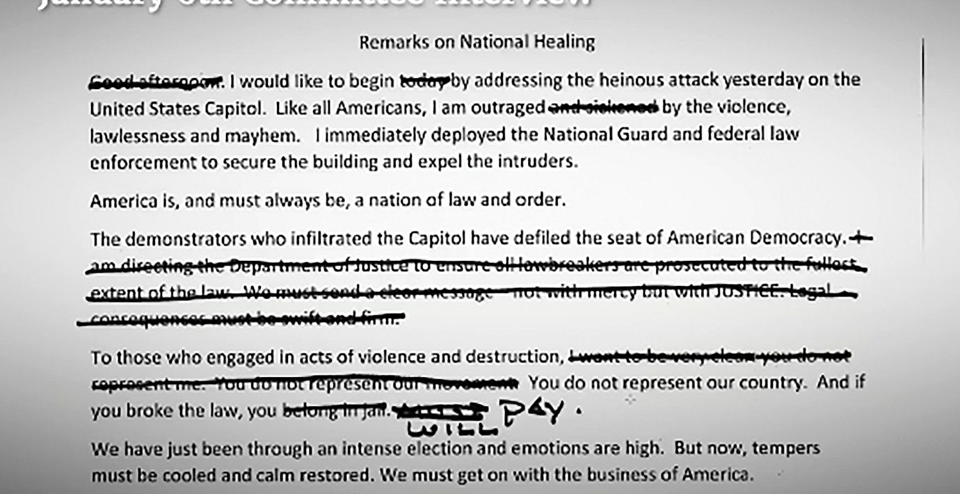 Donald Trump skulle hålla ett tal där han starkt fördömde våldet under stormningen av Kapitolium den 6 januari ifjol – men innan talet strök han kritiska meningar ur manuset. Det rapporterar CNN med hänvisning till en ny video som utredningskommittén släppt.