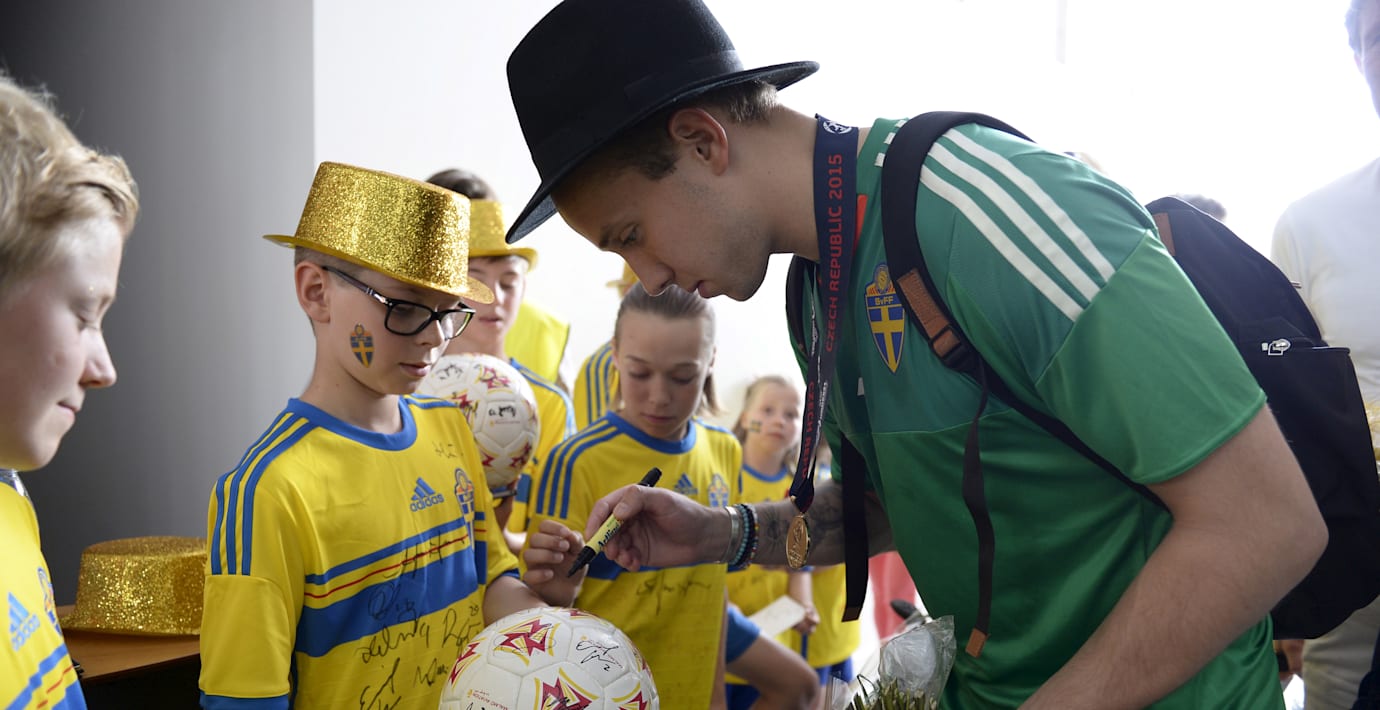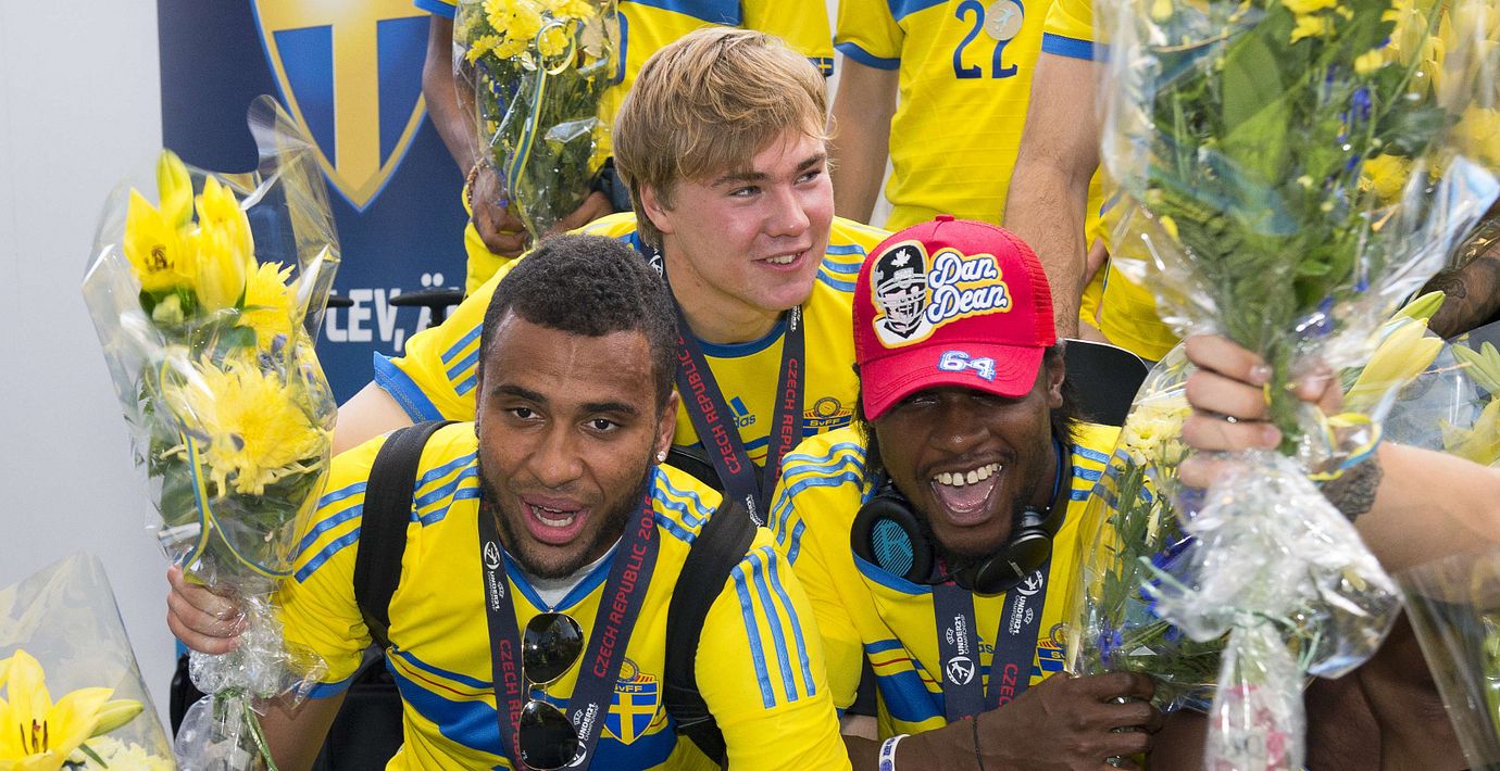 Det svenska U21-landslaget landade tidigare i dag på Bromma flygplats. Planet möttes av en vattensalut vid landningen vid 14.40-tiden. Den sista biten fick de sällskap i luften av två Jas-plan från F 17 i Ronneby som eskorterade U21-laget. Stockholmare kunde få en skymt av hjältarnas färd när de flög över huvudstadens centrala delar kort före landningen.