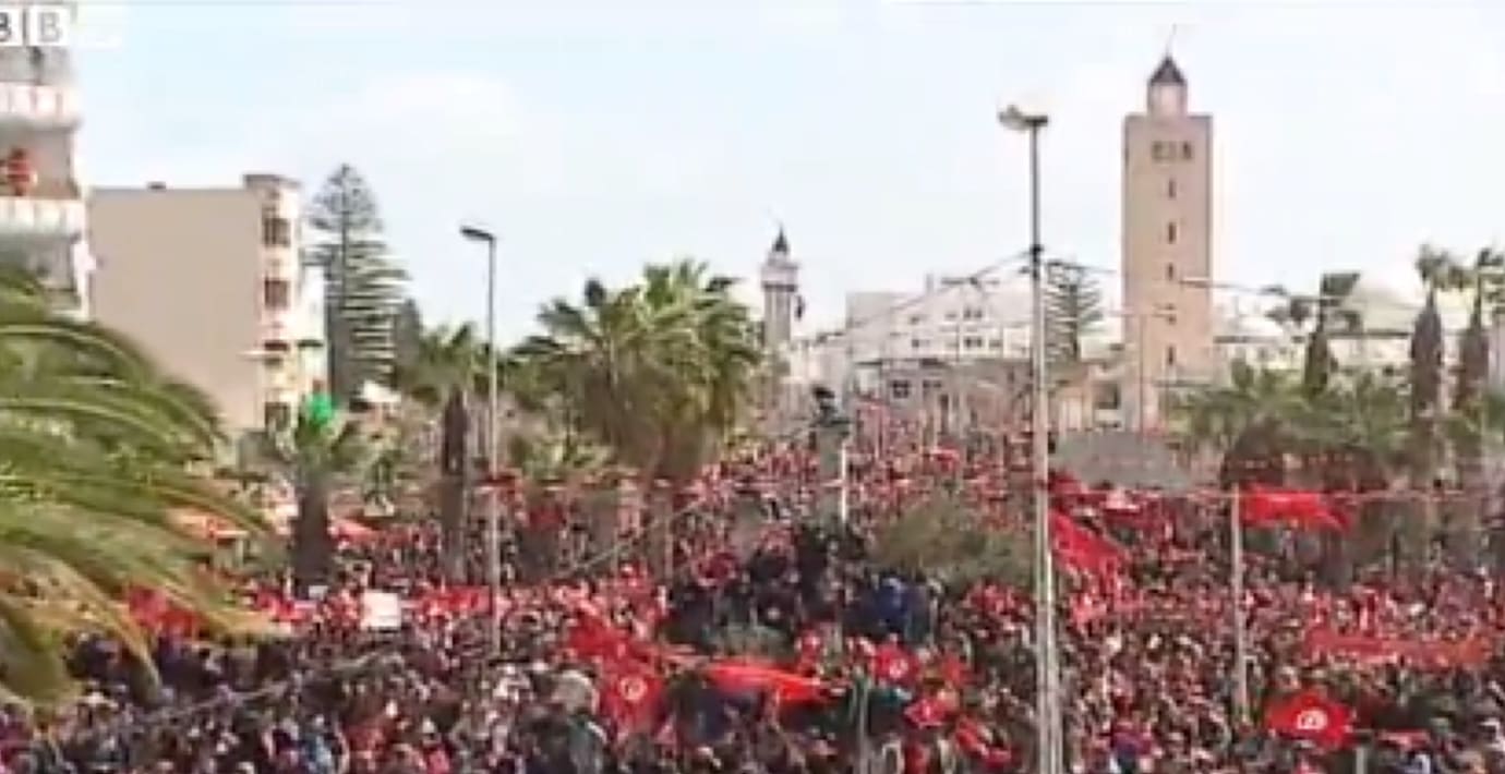 Runt 12 000 tunisier samlades för att marschera mot extremism efter den attack mot Bardomuseet i Tunis där 21 människor miste livet. Många viftade med tunisiska flaggor och ropade ”Tunisien är fritt! Ut med terrorismen”.