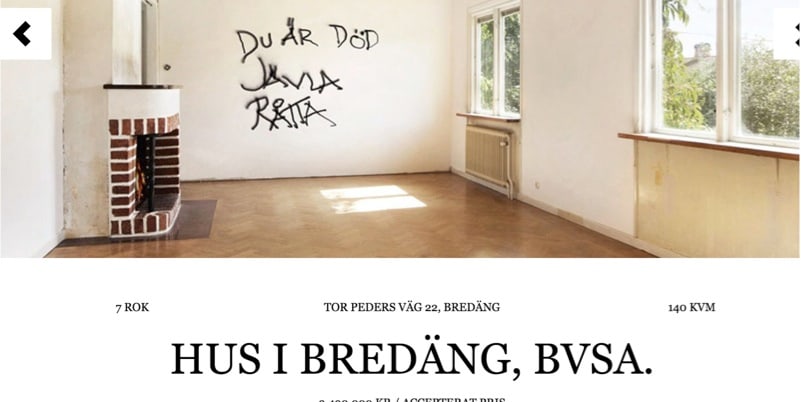 Bostadsannonsen ser först (nästan) helt normal ut. Men den som är uppmärksam upptäcker att huset i Bredäng har klotter på husgrunden. Ett par bilder senare syns kulhål i en vägg, blodspår efter en gräsklippare i garaget och hotfullt klotter intill öppna spisen. Något stämmer inte riktigt med annonsen och mycket riktigt, den är inte äkta. Den som försöker ta sig vidare till andra objekt på sajten, eller kontakta mäklaren, får upp en reklamfilm för TV4:s nya serie ”Torpederna”. Annonsen, som har fått stor spridning i sociala medier, är ingenting annat än en lyckad pr-kupp.