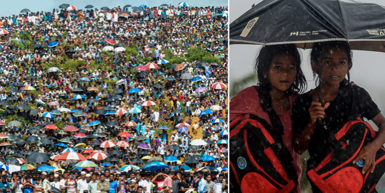 I lägret Kutupalong bar människor under söndagen plakat med budskap som: ”Aldrig igen! Minnesdag för folkmordet på rohingyer” och ”återbörda våra medborgarskap”.