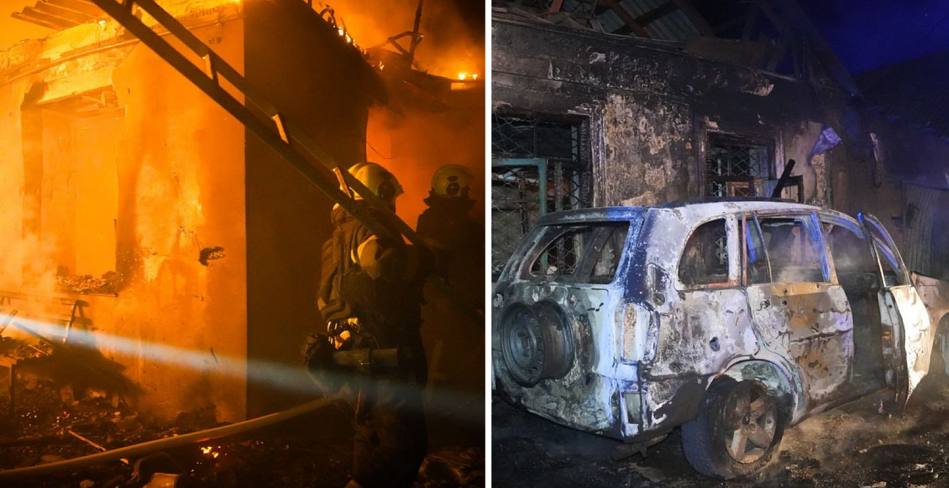 Flera bränder bröt ut och flera bostäder förstördes. Ett lager och en energianläggning uppges också ha skadats.