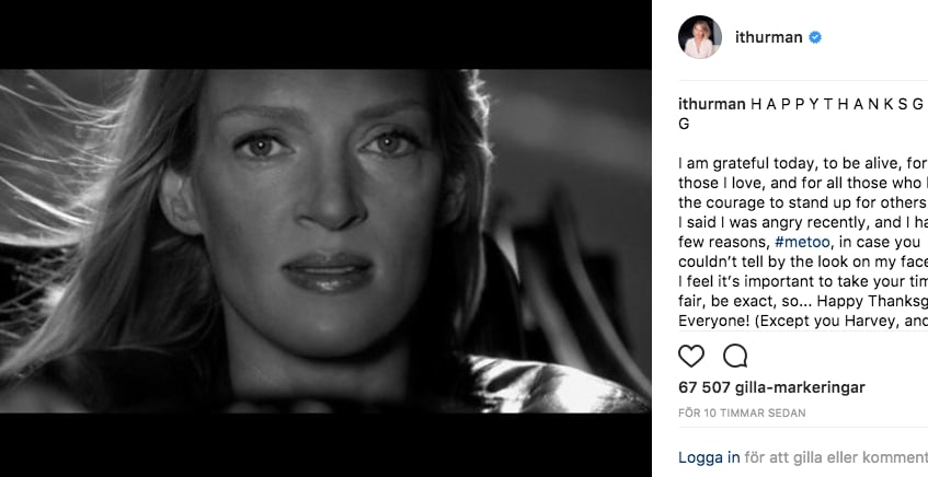 Thurman har jobbat tillsammans Weinstein i sammanlagt sju filmer, bland annat Pulp Fiction och Kill Bill. Sitt inlägg har hon bildsatt med en scen av sin roll i Kill Bill.