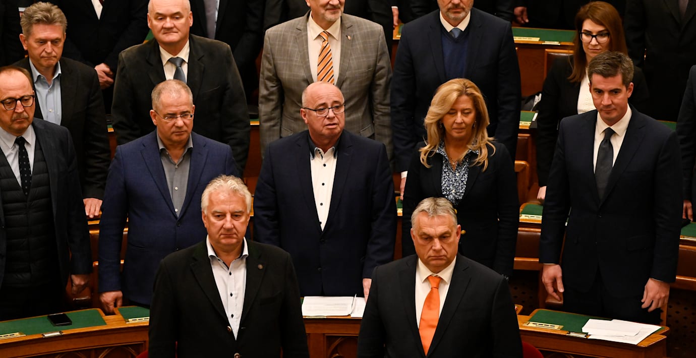 Ungerns premiärminister Viktor Orban, längst ner till höger, i det ungerska parlamentet. (Denes Erdos / AP)