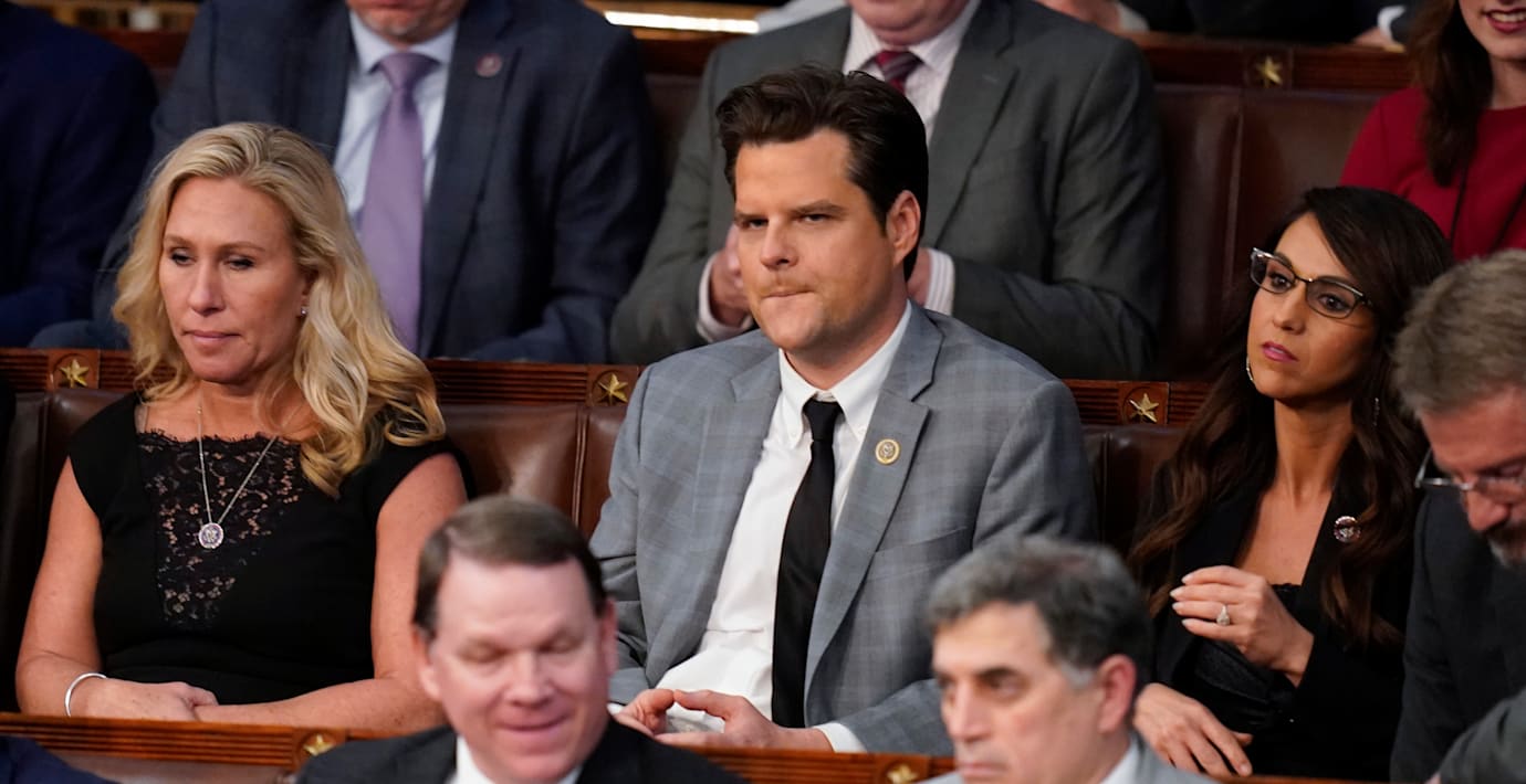 En bild tagen av Bloomberg-fotografen Al Drago visar hur republikanen Marjorie Taylor Greene viftar med sin telefon mot partikollegan Matt Rosendale. På skärmen syns ett samtal med ”DT”, vilket antas vara expresidenten.