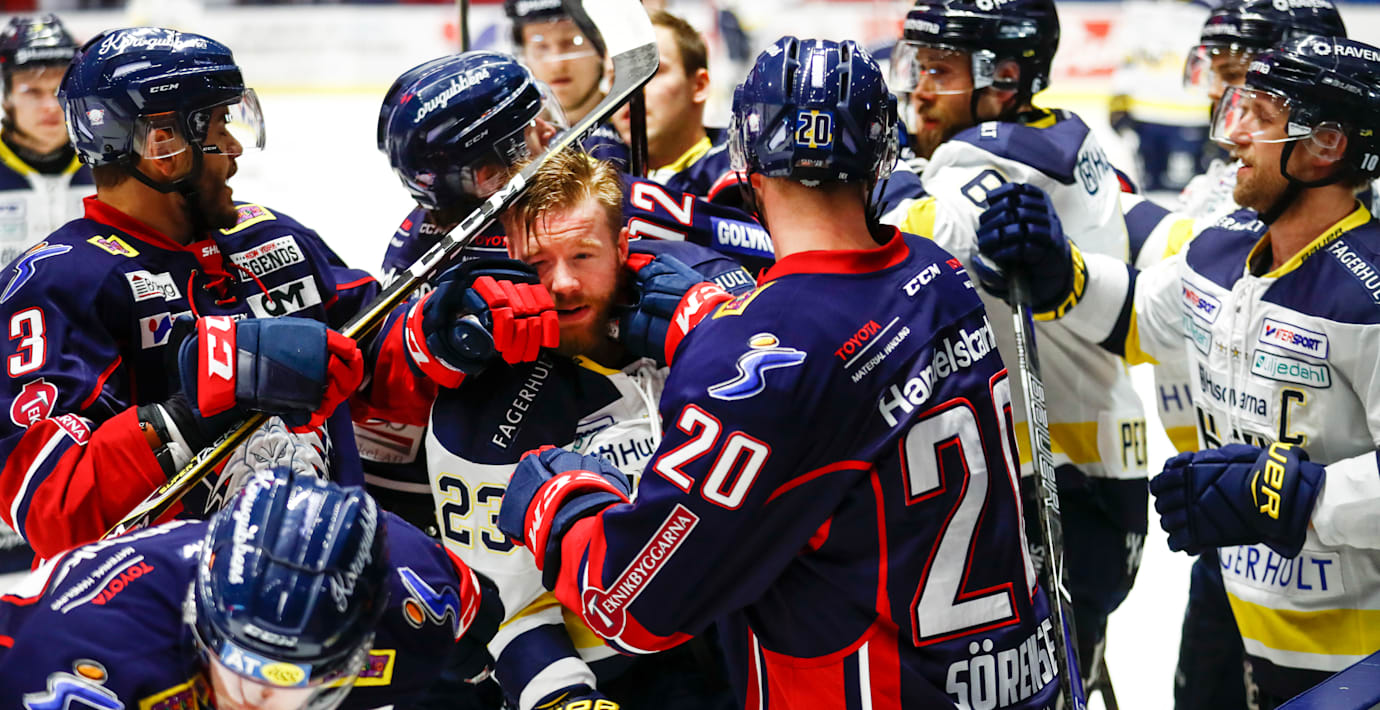Det hettade till redan på uppvärmningen inför åttondelsfinalen i SHL mellan Linköping och HV71. Först började LHC:s Emil Sylvegård knuffas med två HV-spelare och därefter startade HV:s Marc Zanetti ett slagsmål vid avbytarbåsen.