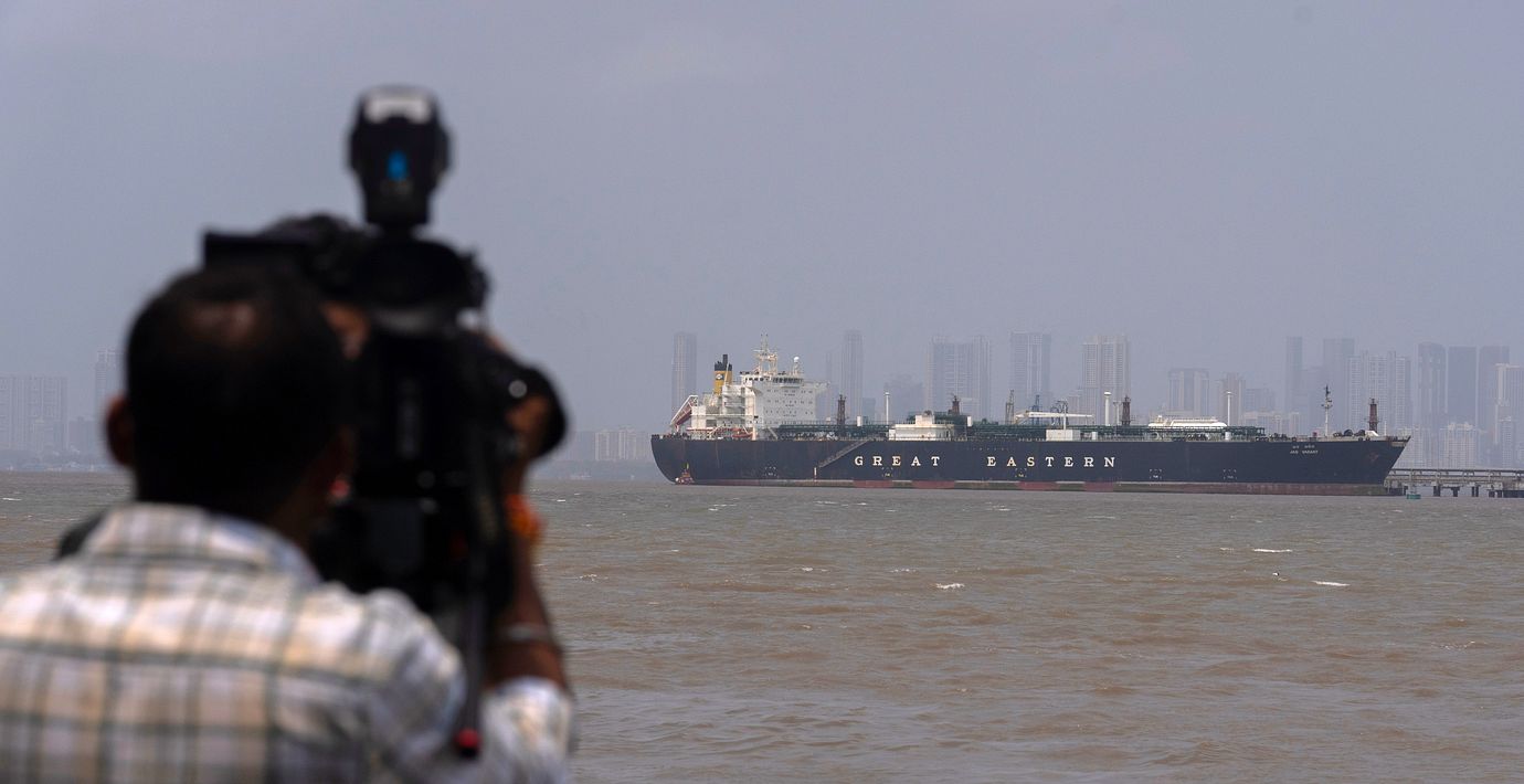 Arkivbild på ett fartyg som passerade Hormuzsundet den 1 april. (Rafiq Maqbool /AP/TT / AP)