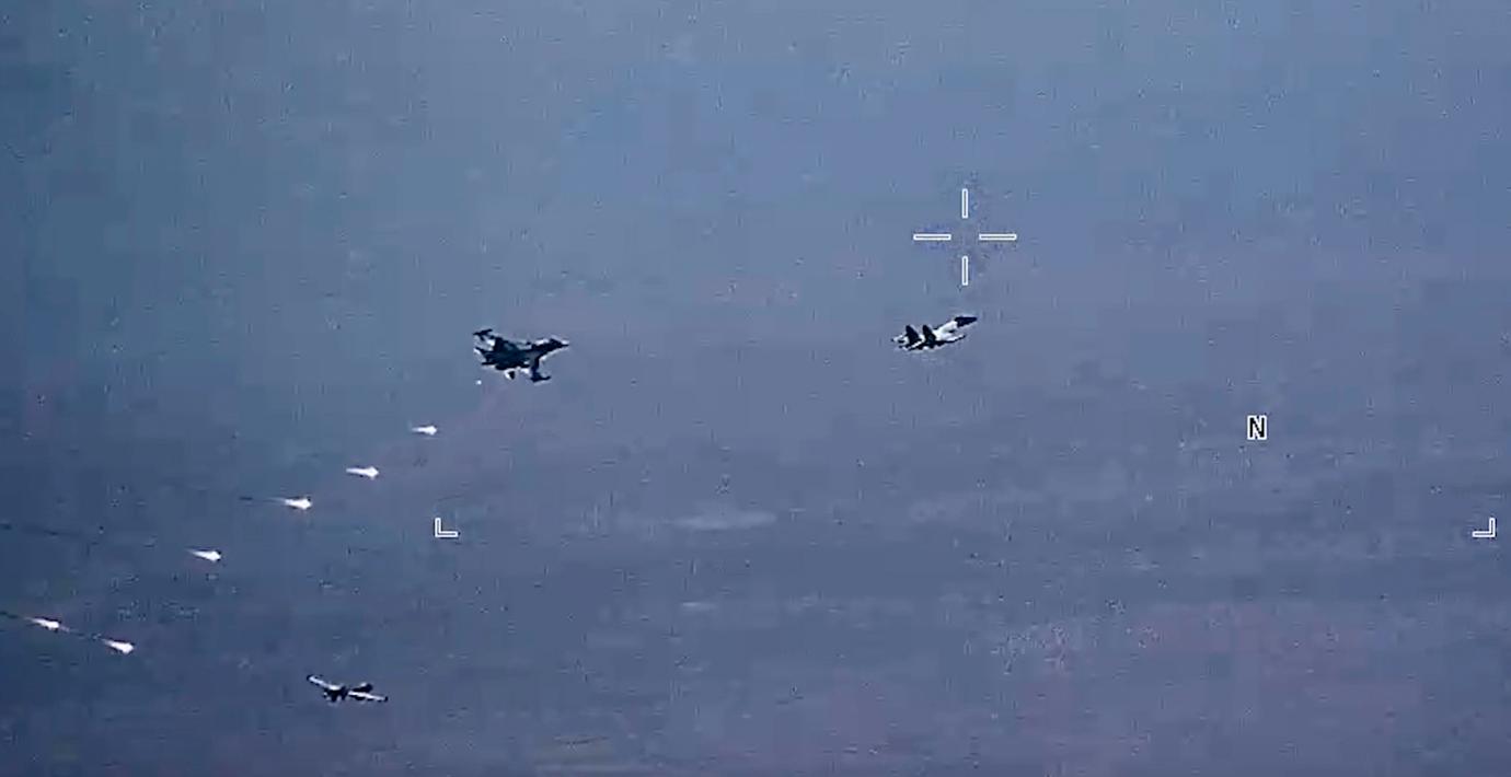 Det amerikanska flygvapnet har släppt videomaterial på mötet med de ryska SU-35-flygplanen, som tvingade drönarna att göra undanmanövrar.