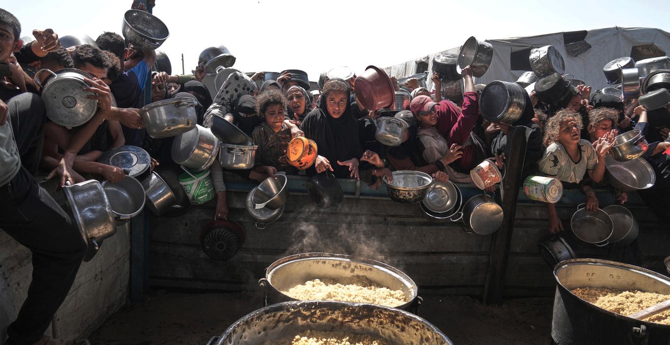 Palestinier vid ett donationskök i Khan Younis i södra Gaza. (Abdel Kareem Hana / AP)