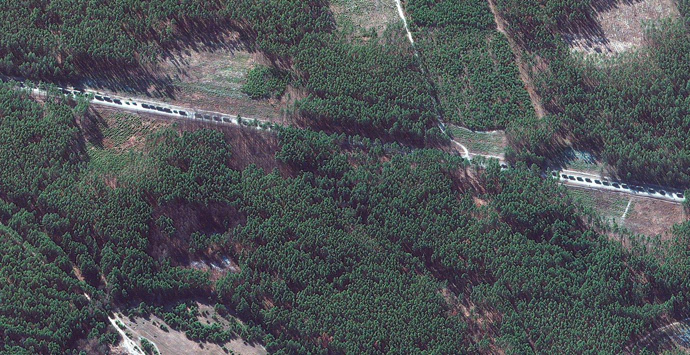 Sent på måndagen rapporterades att kolonnen, bestående av bland annat stridsfordon, sträcker sig längre än 64 kilometer. Detta baserat på satellitbilder från det amerikanska företaget Maxar Technologies.