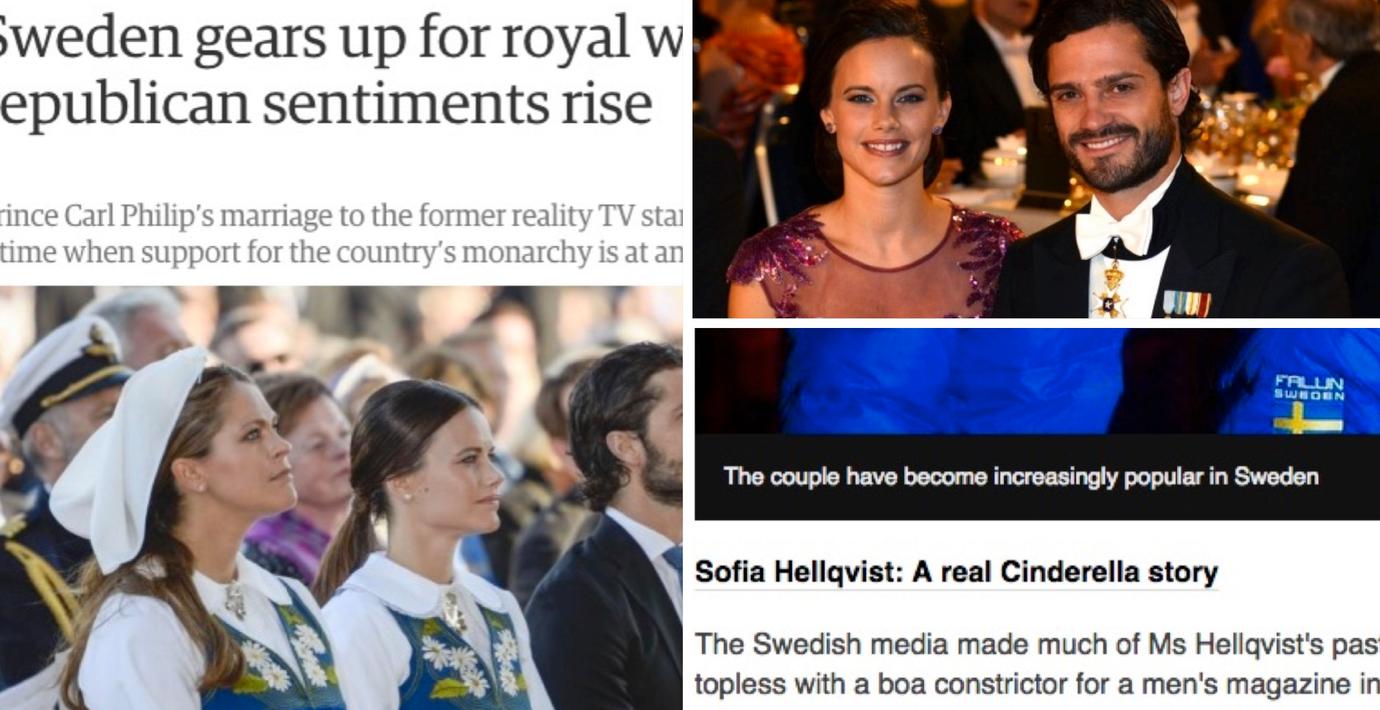 Men det finns också mer seriösa anslag. Brittiska The Guardian fokuserar på att bröllopet hålls samtidigt som stödet för kungahuset är rekordlågt: ”I ett jämlikt land där multikulturialism firas och ateism är norm verkar en vit patriarkal, protestantisk institution (som kungahuset) stå för allt som Sverige empatiskt vänt ryggen”.