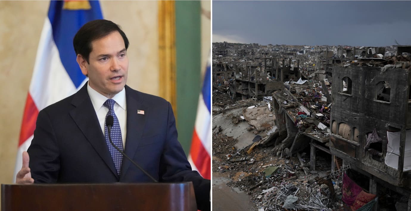 Rubio upprepar Trumps ord om att Gaza är obeboeligt i dagsläget, och säger att presidentens avsikt är att uppmuntra andra länder ”med tillräckliga ekonomiska och teknologiska förmågor” att hjälpa till att bygga upp Gaza igen.