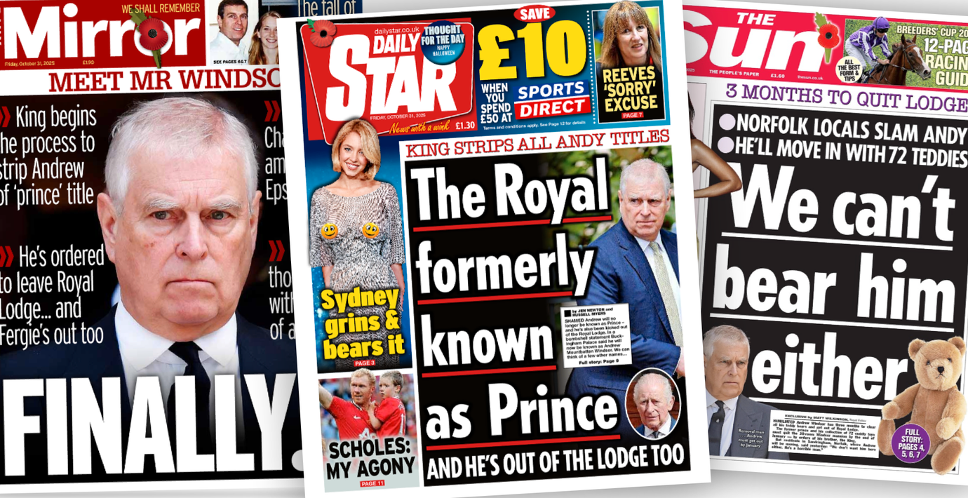 Beskedet att prins Andrew fråntas sina kungliga titlar har sysselsatt brittisk press i flera dagar. Framför allt tabloidtidningarna tävlar om vem som kan håna Andrew på det mest kreativa sättet.