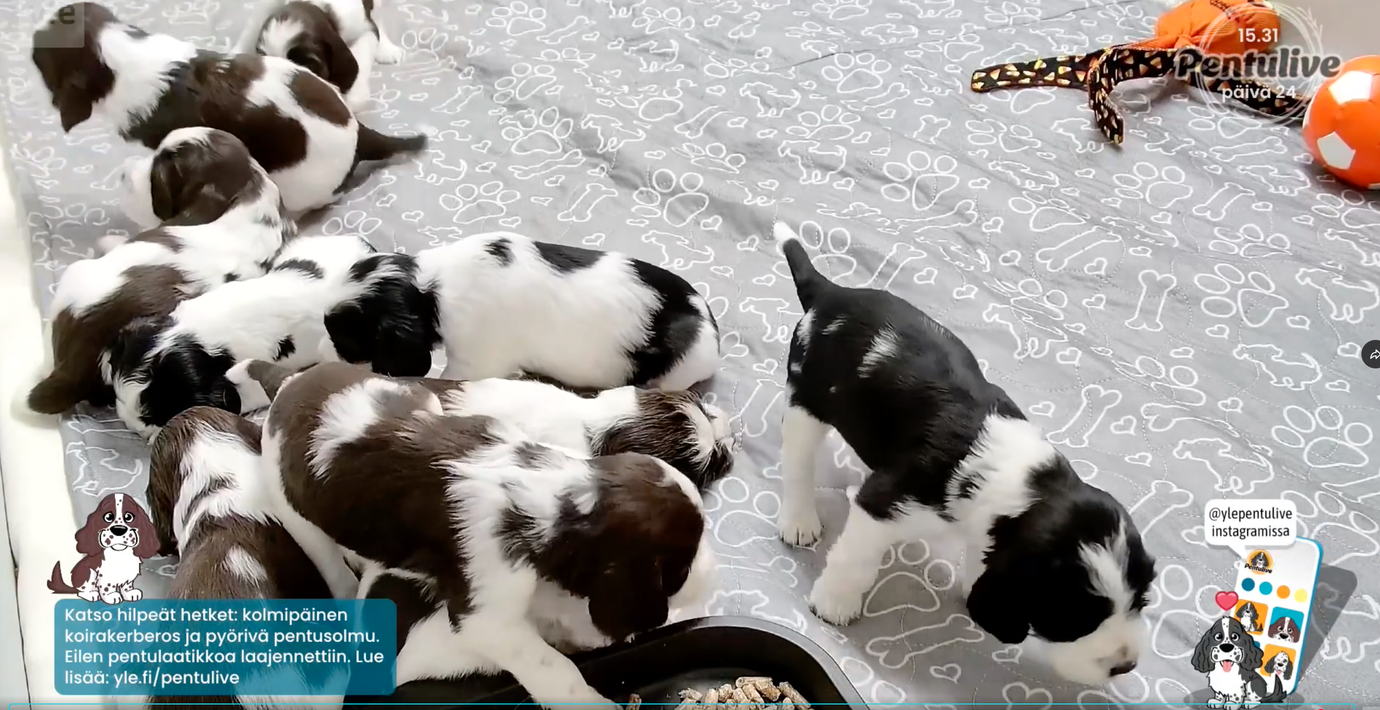 En direktsändning med elva valpar gör just nu succé i Finland, rapporterar Ekot och beskriver det som grannlandets motsvarighet till slow tv-konceptet ”Den stora älgvandringen”.