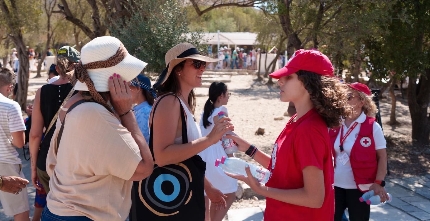 Under de öppna timmarna är Röda korset på plats och delar ut vatten till de köande besökarna.