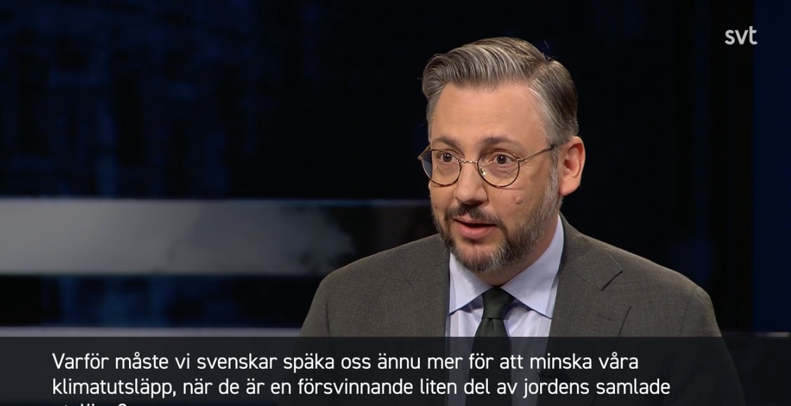 På en fråga från en tittare om varför Sverige ska späka sig för att klara klimatmålen trots att landet står för en liten del av de globala utsläppen svarar Muharrem Demirok (C) att det egentligen är tvärt om – och att klimatomställningen är en fantastisk möjlighet för en regering som vågar satsa på gröna företag.