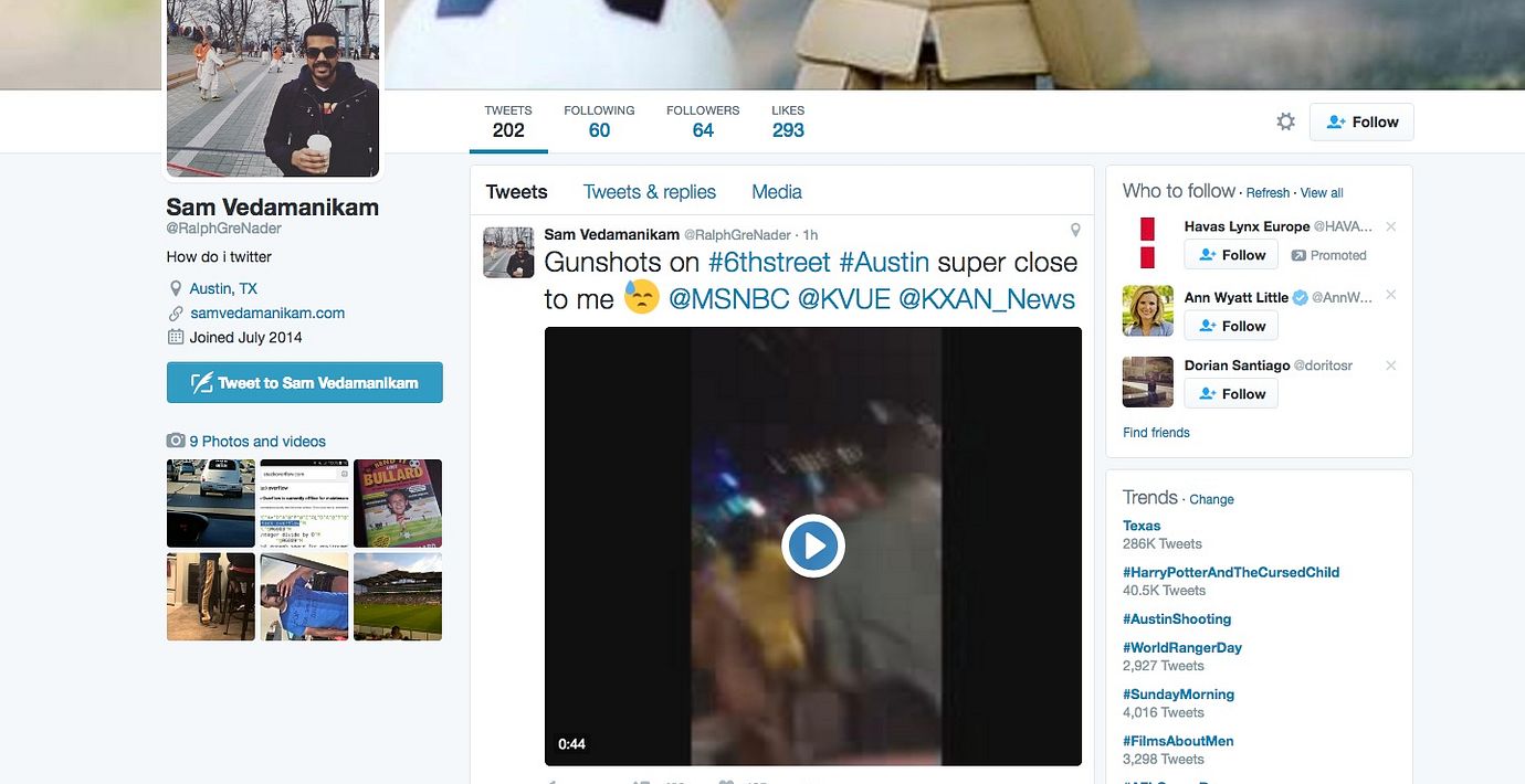 Filmen är upplagd på Twitter av Sam Vedamanikam, som skriver att han bor i Austin.