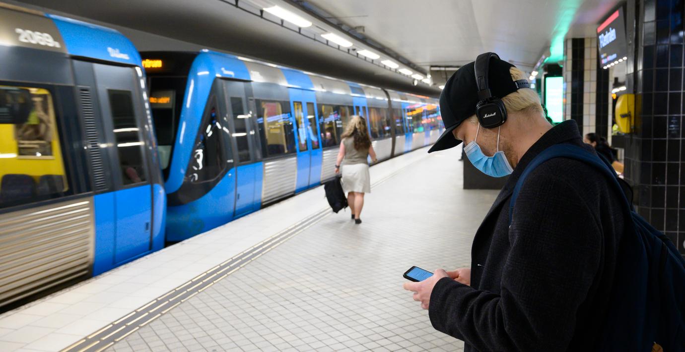En person med anisktmask på T-centralen i Stockholm. (Henrik Montgomery/TT / TT NYHETSBYRÅN)