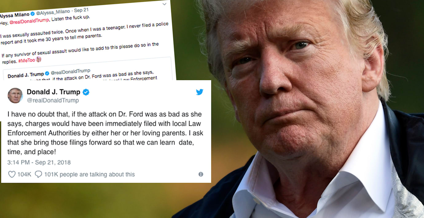 Donald Trump ifrågasatte Christine Blasey Fords uppgifter om att Brett Kavanaugh, som Trump nominerat till USA:s högsta domstol, begått ett sexövergrepp under deras tonårstid. Vore det sant skulle hon ha anmält tidigare, menade Trump.