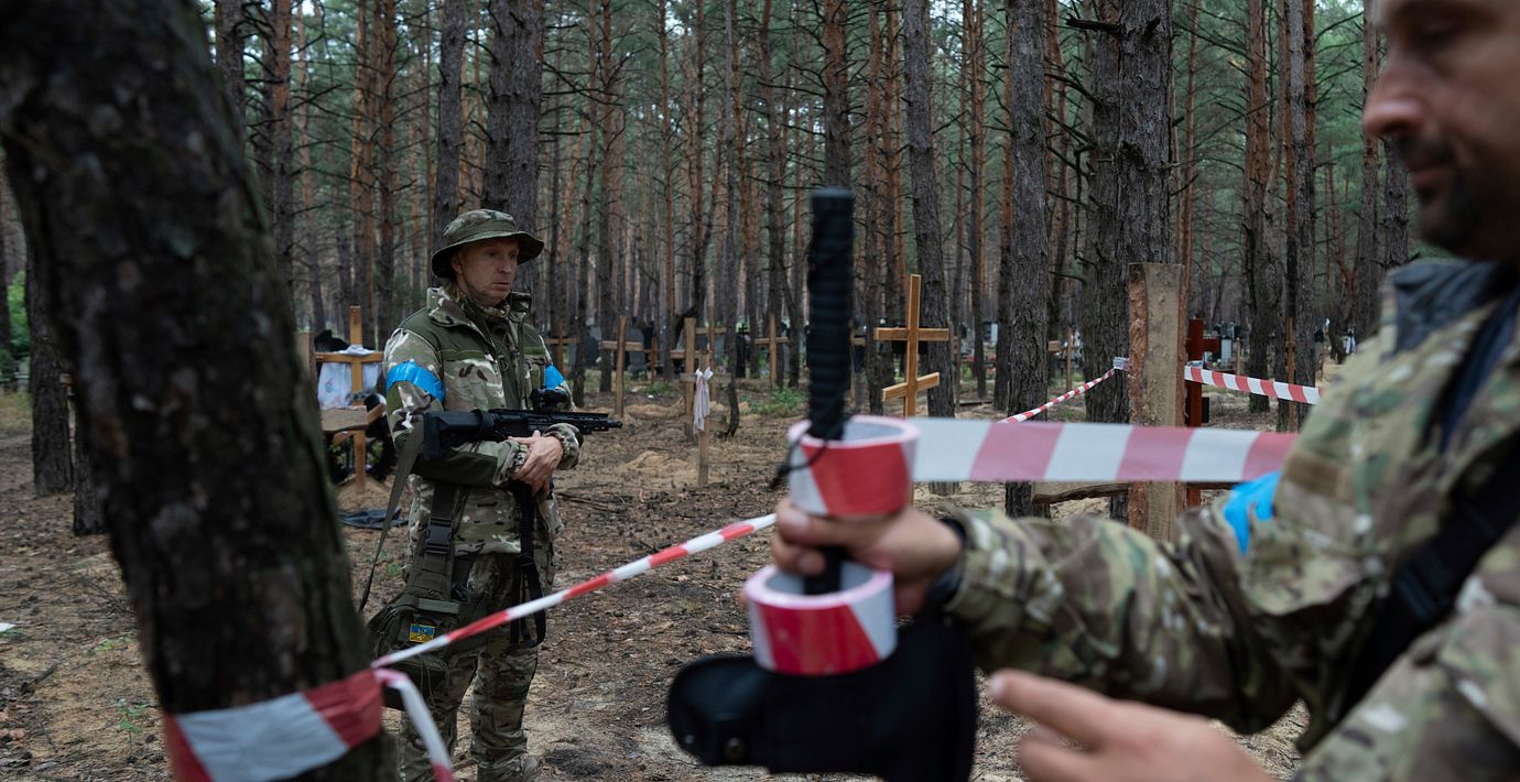 AP, på plats i Izium, rapporterar att en märkning uppger att 17 ukrainska döda soldater ligger på samma plats samt att hundratals kors markerar individuella gravar. Enligt Sky News rör det sig om minst 440 döda.