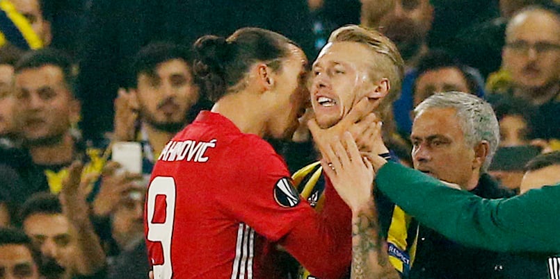 Zlatan Ibrahimovic hamnade i storbråk med den danske backen Simon Kjaer i Europa League-mötet med Fenerbache på torsdagskvällen. Kjaer blev irriterad efter en närkamp med Ibrahimovic, som svarade med att ta strypgrepp på Kjaer.